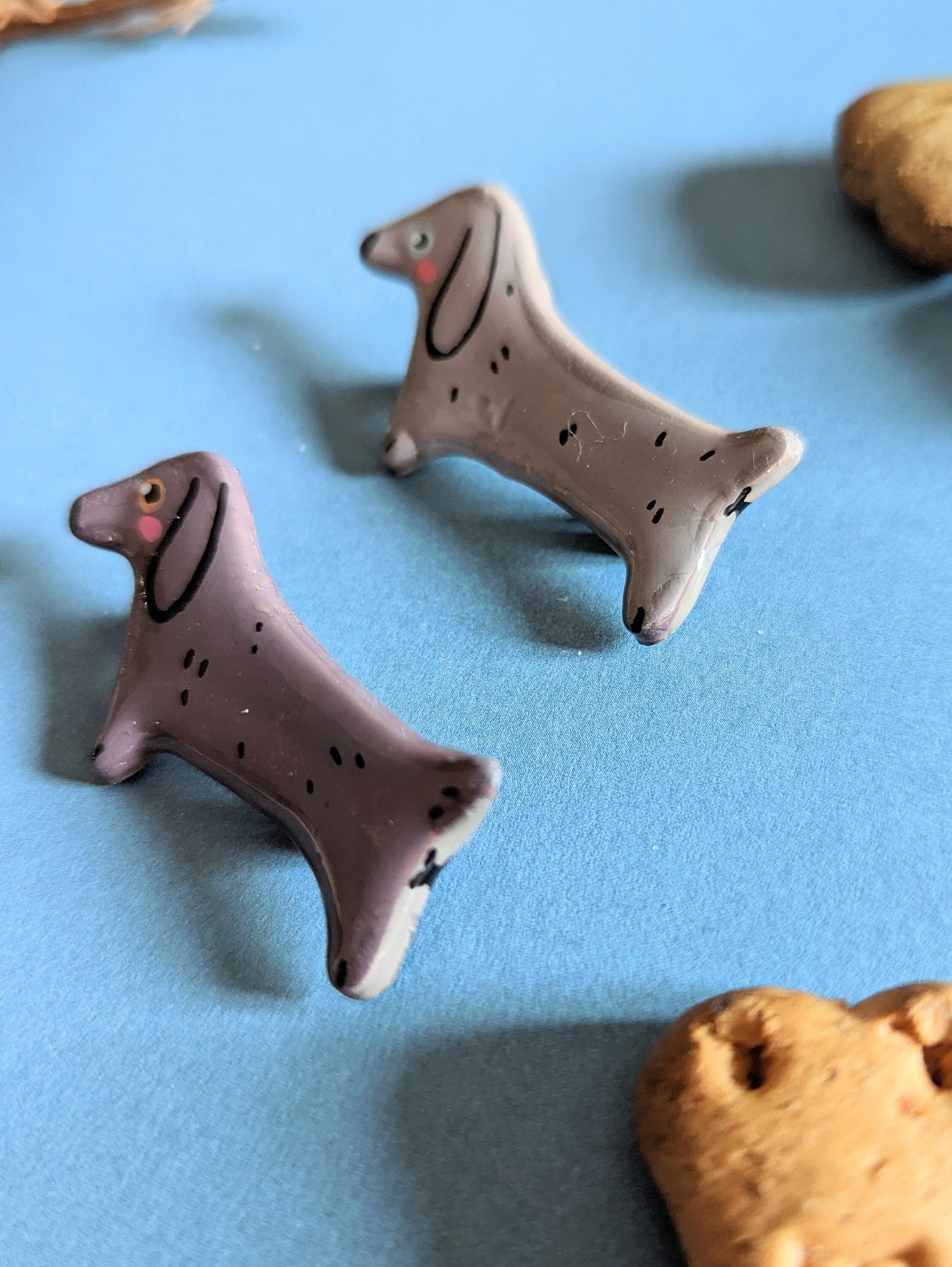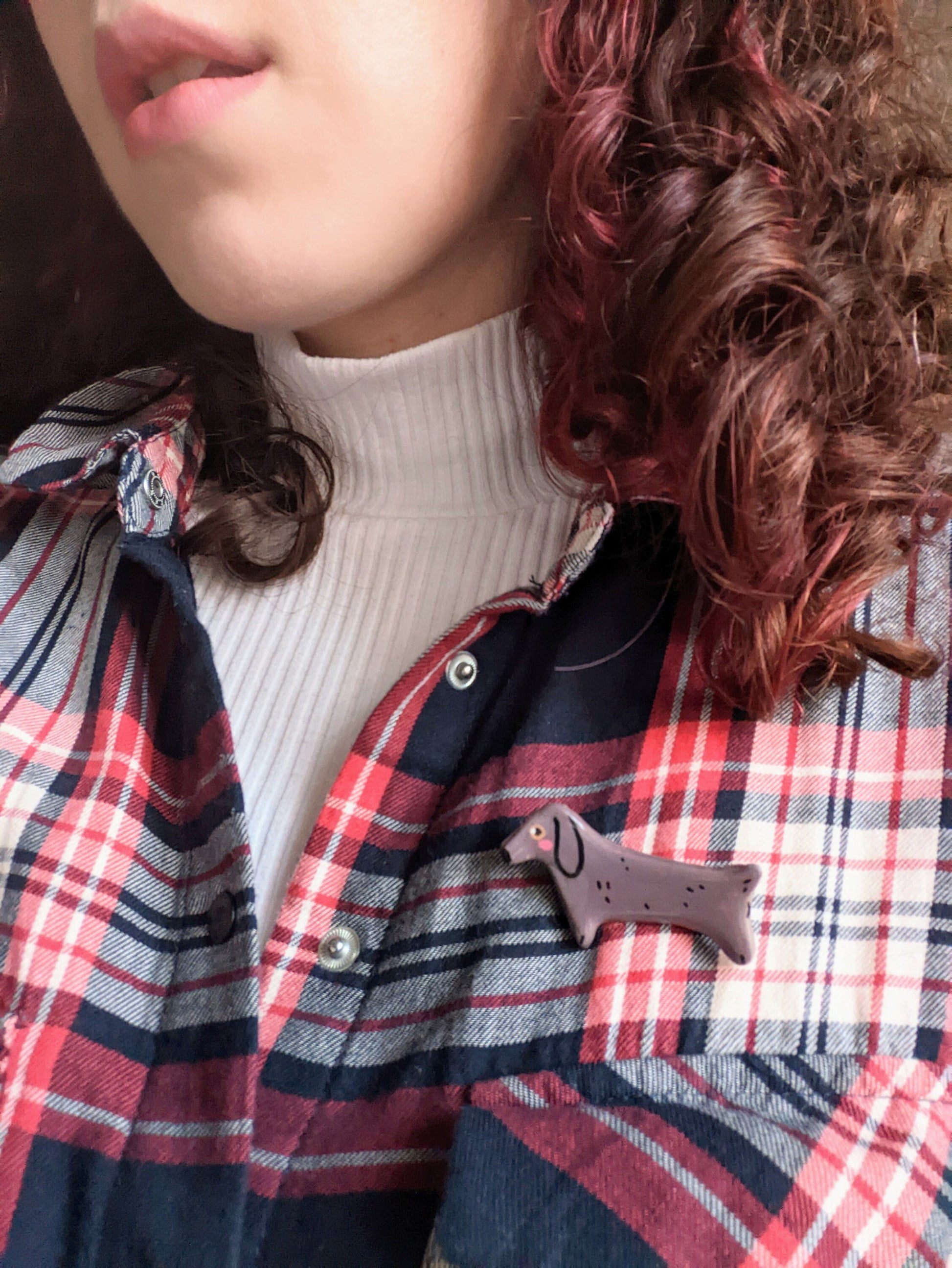 petite broche teckel en pâte polymère, modelée et peinte à la main, recouverte d'une couche de vernis UV qui la rend très solide.