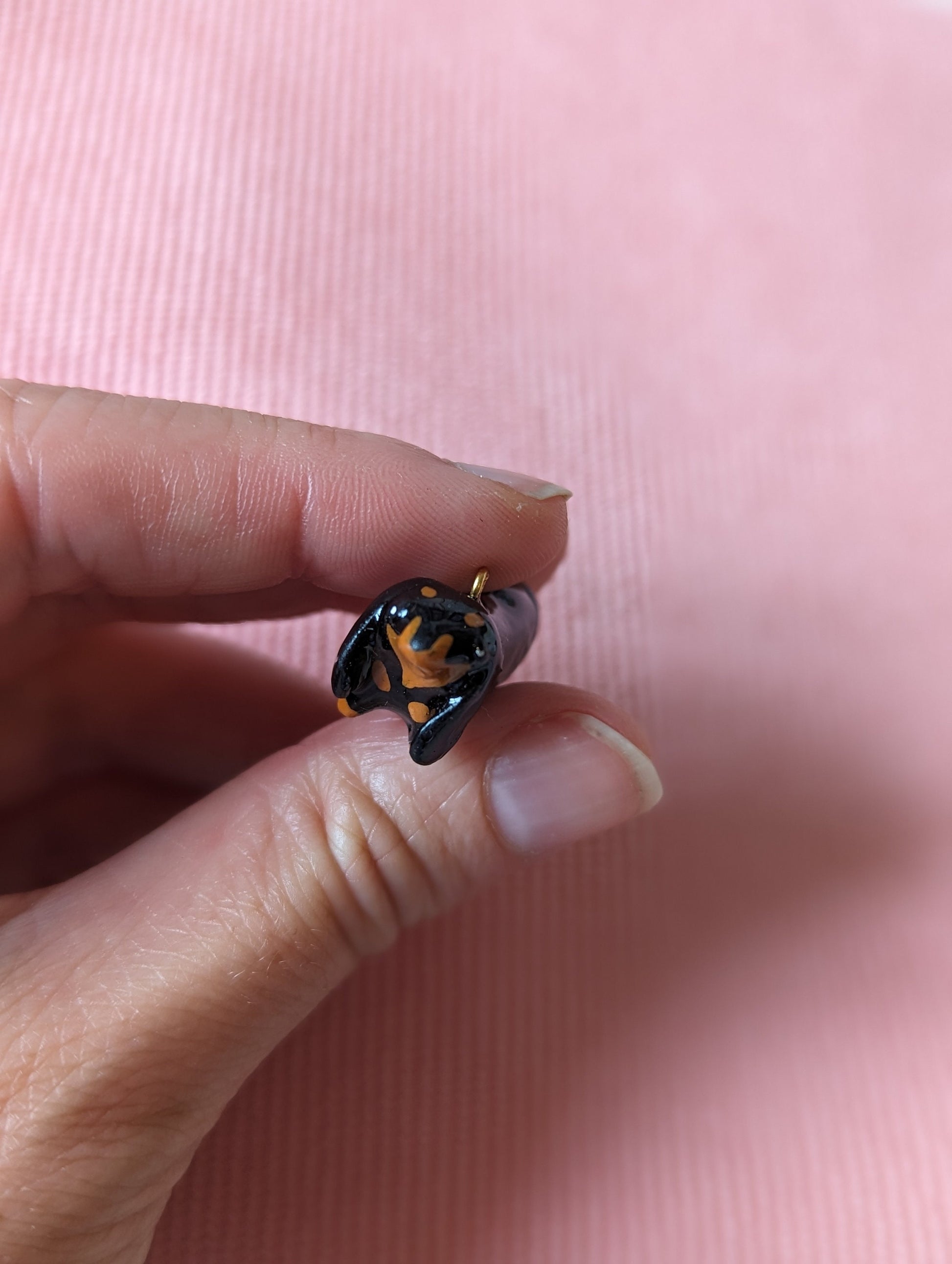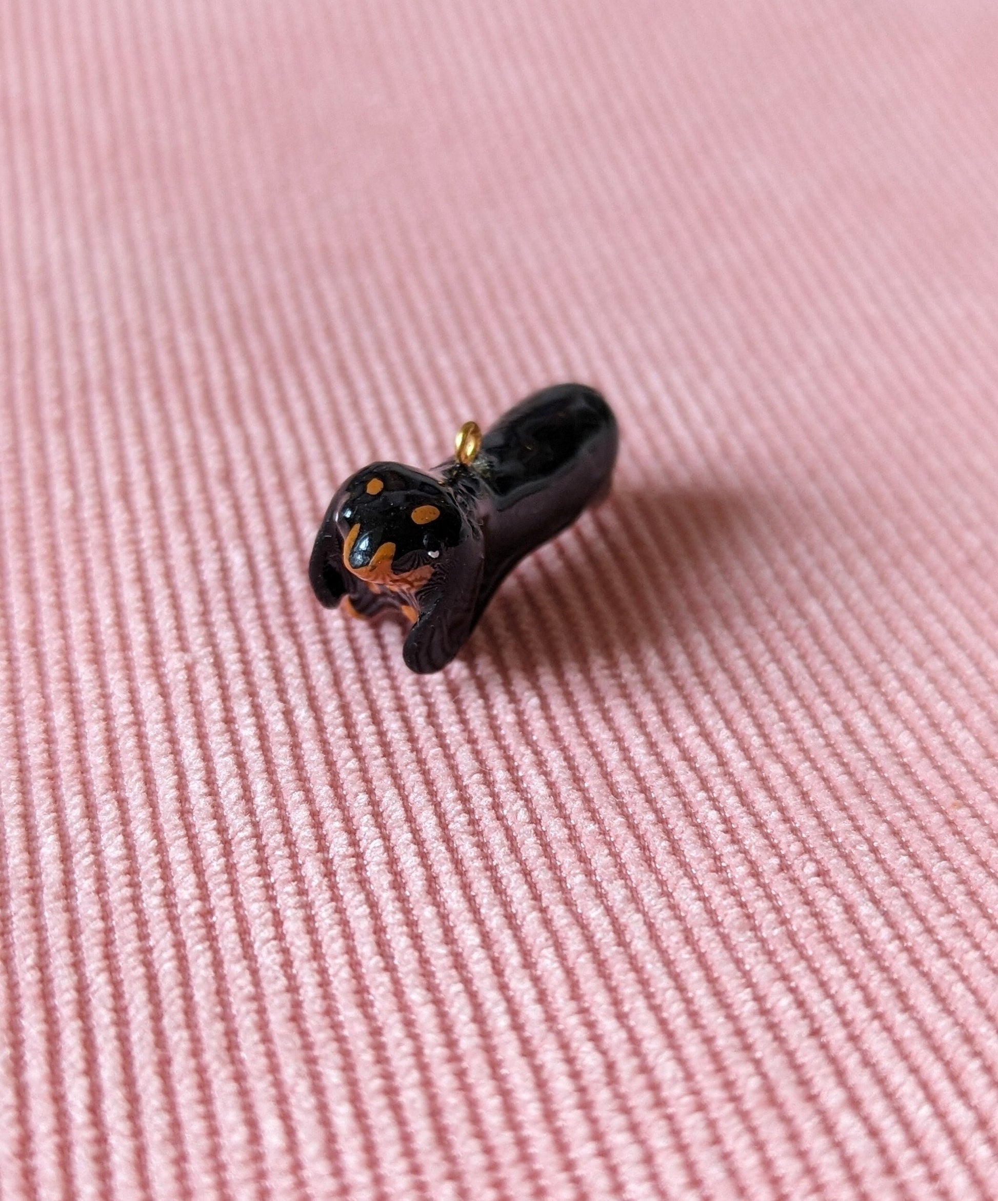 Cette mini figurine de teckel été entièrement modelé à la main en pâte Fimo, peinte puis recouvert d'un vernis UV.