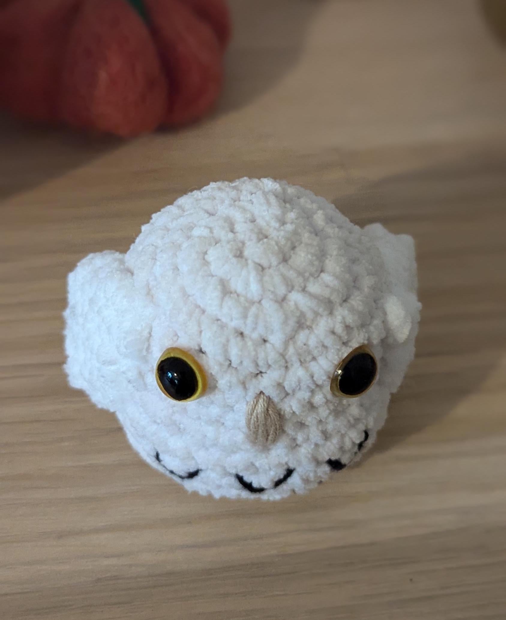 Cette petite peluche trop mignonne de chouette inspirée par Hedwige de Harry Potter est réalisée en crochet avec du fil chenille de la marque phildar (certifié oeko-tex). Elle apportera de la vie dans votre déco d'automne ou d'Halloween, ou fera une parfaite petite peluche à câliner !