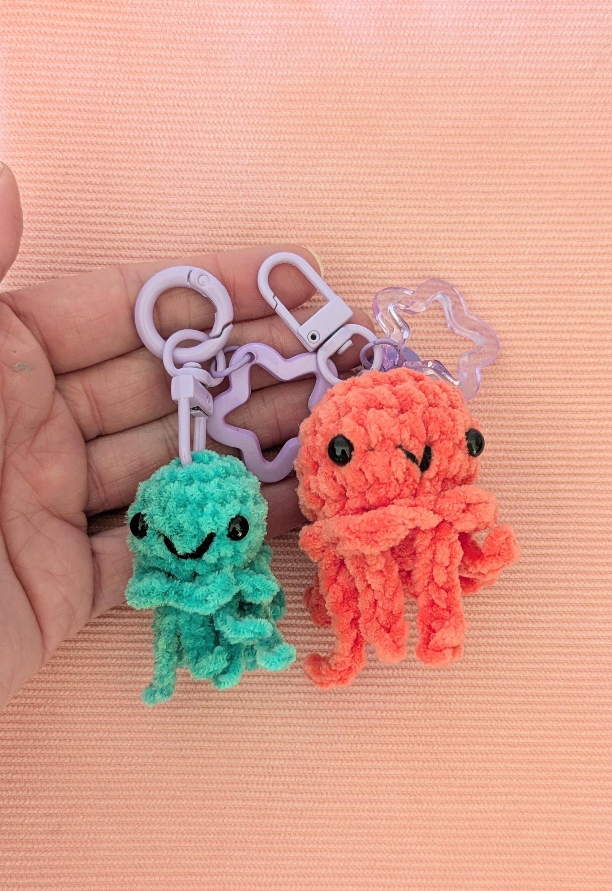 Cette charmante petite peluche méduse toute douce, agrémentée de son porte clé, est réalisée entièrement à la main en crochet avec du fil chenille de la marque DMC.